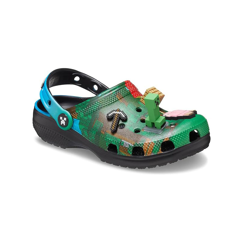 Inspired by the Minecraft universe, this design features a pixelated forest landscape that instantly connects with fans of the game. The clog also includes themed Jibbitz charms, such as tools and characters, adding a playful and collectible element to the pair.